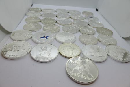 Pakkuda siis kokku 31 Soome, Itaalia, Kreeka hõbemünti, enamuses Soome mündid. Hõbemündid on valmistatud 925 prooviga hõbedast; kaal keskmsiselt ~24-26 grammi. Mündid on lahtiselt ja kaaluvad kokku 803,10 grammi. Antud hõbemünte on võimalik EELNEVAL KOKKULEPPEL näha ja osta meie kontoris Sõle 19, E-R 10-18 ja L-P kokkuleppel. Turuhind hõbemüntidena 1150-1250 euro; turuhind materjalina 1070-1120 eurot, Meie hind ainult 1025.-Eurot!