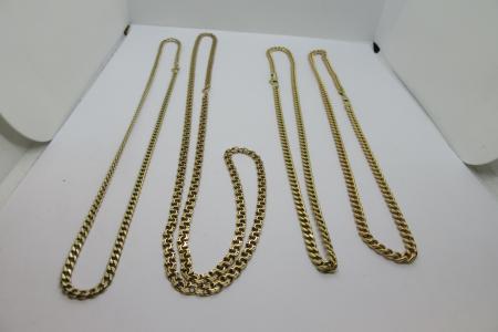 Pakkuda siis valik erinevaid 585 prooviga kuldkette peaaegu ainult materjalihinnaga. Kokku 4 erinevat kuldketti: 3 pantserit ja üks Bismarck. Fotol vasakult paremale: Pantser 14,10gr 48,5cm; Bismarck 16,97 gr 70,5cm; Pantser 10,68 gr 46 cm ja Pantser 10,67 gr 45,3 cm. Kõik ehted kannavad proovi 585 ja enamikel peal ka meistrimärgid-kvaliteedimärgid, või aastamärgid jne. Ehted sobivad soovi korral sulatamiseks, sest müüakse peeaegu ainult materjalihinnaga, või siis edasimüümiseks, osaliselt kandmiseks ja osaliselt sulatamiseks vastavalt siis Ostja soovile. Ehteid antud valikust eraldi ei müü, kuldketid kaaluvad kokku 52,40 grammi. Kuldehteid on võimalik EELNEVAL KOKKULEPPEL võimalik näha ja osta meie kontoris Sõle 19, E-R 10-18 ja L-P kokkuleppel. Turuhind ehetena 3780-4000 eurot, Meie hind 3550.-Eurot.