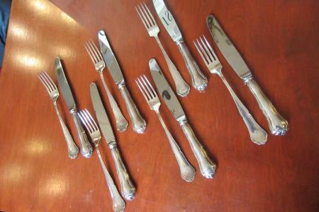 Väga sümpaatsed Chippendale stiilis söögiriistad. Hõbenugade ja kahvlite sabad kaunistatud reljeefse krooniga. Hõbeesemed on valmistatud Soomes ja kannavad proovi 830, lisaks peal ka tehase- ja kvaliteedimärk ja aastamärk H8(mis märgib aastaks 1985). Hõbekahvlid üleni hõbedast ja pikkuseks on 17,6 cm ja nugade pikkuseks 19,6 cm, nugadel on sabad hõbedast ja terad metallist, sest hõbe oma iseloomult pehme ja näiteks liha lõikamiseks mittesobiv, üldkaaluks 597 grammi, kahvlid üleni hõbedast ja nende kaal 213,5 grammi, nugadel siis terad ja käepideme sisu mitte hõbe. Väga ilus 6-ne hõbesöögiriistade komplekt, mis sobib ideaalselt nii koheseks kasutamiseks, kui ka kingituseks! Esineb minimaalseid kasutusjälgi. Hõbeesemed on valmistatud Soomes. Antud söögiriistade komplekti on võimalik näha ja osta EELNEVAL KOKKULEPPEL meie kontoris Sõle 19, E-R 10-18 ja L-P kokkuleppel. Uued maksaks täna 750-990 eurot, turuhind kasutatuna 400-480 eurot, meie hind 289.-Eurot!