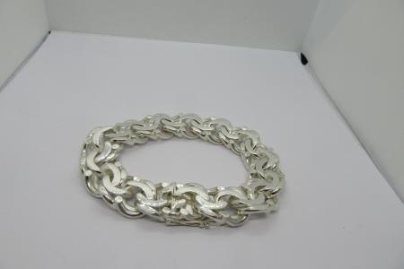 Täiesti uus ja Eestis käsitööna valmistatud Bismarck mustriga hõbekäekett. Käeketi pikkuseks on 23 cm-i ja laius 18 mm ja keti kõrgus 6 mm-i. Käeketi kaaluks 126,12 grammi ja kannab proovi 925, korralik karplukk ja turvaaas ning peal ka meistrimärk ja meie firmamärk TL. Käeketti saab EELNEVAL KOKKULEPPEL näha ja osta meie kontoris Sõle 19, E-R 10-18 ja L-P Kokkuleppel. Turuhind puudub, sest pole ühtegi nii suurt käsitöö hõbekäeketti müügis, kui eritellimusel teha lasta siis eeldatav kulu 690-790 eurot, Meie hind 550.- Eurot.