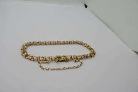 Täiesti uus ja Eestis käsitööna valmistatud Bismarck mustriga kuldkäekett naistele. Käeketi pikkuseks on 18 cm-i ja laius 5,8 mm ning kõrgus 2,3 mm. Kuldkäeketil on karplukk ja turvaaas, ning turvakett pikkusega 7 cm. Käeketi kaaluks 12,79 grammi ja kannab proovi 585, peal ka meistrimärk ja meie firmamärk TL. Ketti saab EELNEVAL KOKKULEPPEL näha ja osta meie kontoris Sõle 19, E-R 10-18 ja L-P Kokkuleppel. Turuhind 1390-1550 eurot, Meie hind 1235.- Eurot.